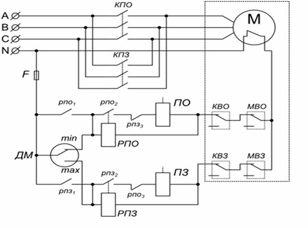 - На КВО размыкается контакт КВО1, и пускатель ПО выключается. Вместе с ним останавливается и двигатель привода.